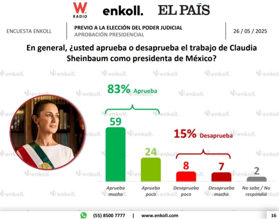 Noticias La presidenta Claudia Sheinbaum tiene el 83% de aprobación. Encuesta Enkoll mayo 27, 2025 El Humanista. Ciudad de México.— La presidenta Claudia Sheinbaum registra un sólido respaldo ciudadano, con un nivel de aprobación del 83 por ciento, de acuerdo con los resultados de una encuesta reciente…