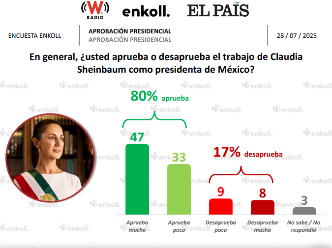 Noticias 80% de mexicanas y mexicanos respaldan a Claudia Sheinbaum tras 10 meses de gobierno: Enkoll julio 31, 2025 El Humanista. La presidenta Claudia Sheinbaum conserva un alto nivel de aprobación ciudadana, alcanzando un 80% de respaldo a su gestión, según revela la encuesta publicada este miércoles por Enkoll. El apoyo…