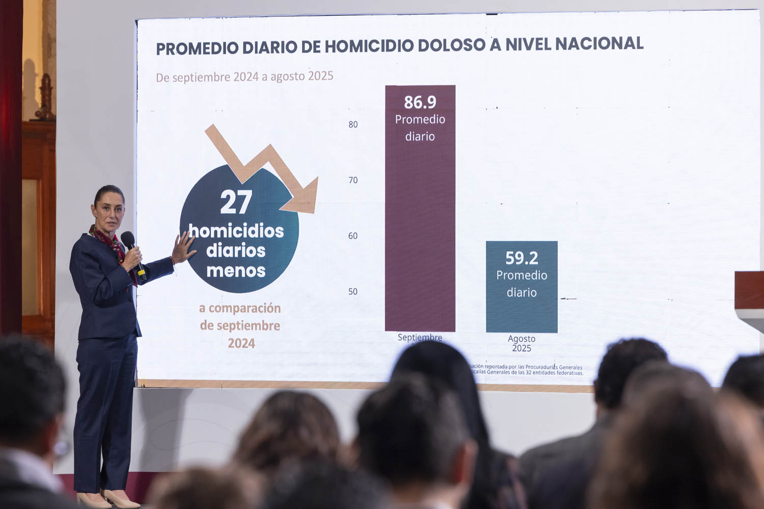 Noticias Reducción en homicidios. Claudia Sheinbaum septiembre 10, 2025 El Humanista. Ciudad de México.— El Gobierno de México informó que en agosto de 2025 se registró una disminución del 32 por ciento en los homicidios dolosos respecto a septiembre de 2024,…