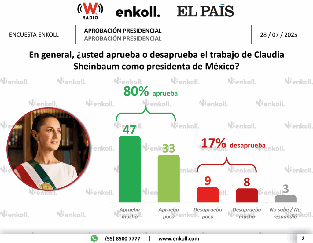 Claudia Sheinbaum: 8 de cada 10 mexicanos la respaldan A solo 10 meses de haber asumido la presidencia, Claudia Sheinbaum goza de una aprobación del 80% entre la ciudadanía, según la más reciente encuesta de Enkoll. Este nivel de respaldo refleja una amplia confianza en su gestión y en la continuidad del proyecto de la Cuarta Transformación. La mandataria mantiene altos niveles de popularidad gracias a sus políticas sociales, su cercanía con el pueblo y la consolidación de programas prioritarios. La encuesta posiciona a Sheinbaum como una de las presidentas con mayor aprobación en América Latina en su primer año de gobierno. El reto: mantener ese respaldo en medio de una agenda ambiciosa de transformación nacional. Se cumplen 10 meses del inicio del gobierno de la presidenta Claudia Sheinbaum en un contexto que ha puesto a prueba su capacidad y conocimientos. No ha sido sencillo lidiar con Donald Trump que desde su llegada a la presidencia de su país ha sido particularmente agresivo contra los mexicanos. Y qué decir de los temas internos, el proceso de elección de los nuevos integrantes del poder judicial fue acompañado de un intenso debate sobre la reforma estructural más importante impulsada por la Cuarta Transformación y que define de fondo al Humanismo Mexicano. En la encuesta más reciente levantada por Enkoll, y que tuvo una amplia difusión en las redes sociales, se confirma la alta aprobación ciudadana que respalda a la presidenta Claudia Sheinbaum Pardo. El 80% de los mexicanos dicen estar de acuerdo con lo que se ha logrado hasta ahora y expresan su confianza en la presidenta por que la consideran una mujer muy trabajadora (93%), cercana a la gente (86%), preparada para desempeñar el cargo que ocupa (86%), honesta y cumplidora (74%). Además de sus cualidades personales están los resultados en temas que le preocupan a los mexicanos. En primer lugar, la seguridad. El cambio en la estrategia se expresa en tres temas importantes, una mejor coordinación entre los tres niveles de gobierno y las instituciones de seguridad pública de las que son responsables. Más de 34 mil presuntos delincuentes detenidos en lo que va de la administración, entre ellos importantes jefes de los diversos grupos. Y la disminución del 20% en homicidios y en general, los indicadores a la baja en todos los delitos de alto impacto. La puesta en marcha de un nuevo modelo económico que busca impulsar el fortalecimiento de la producción nacional. El Plan México que cuenta con el respaldo de sectores empresariales que dotan de estabilidad, gobernabilidad y el compromiso de inversiones crecientes en sectores claves de la economía. El control de las variables económicas deja sin argumentos a la oposición que se reducido a la marginalidad. El peso se mantiene en el rango de 18/19 pesos por dólar, mejor que en 2018. El precio del petróleo se encuentra por encima de los 64 dólares el barril, tal como se proyectó en el presupuesto. La inflación se mantiene en el 4% y el PIB reportado trimestralmente tiene signo positivo, pequeño pero positivo. El empleo y el ingreso ha mejorado. En el último informe del INEGI se reporta en crecimiento del 16% en los ingresos de la población más pobre del país, resultado no solo de apoyo de la política social, sino también del aumento constante a los salarios. Otro punto que explica el respaldo a la presidenta, son sus posturas públicas en temas de interés social. Se ha expresado por una reforma al régimen político e incluso ha enviado iniciativas al congreso que confirman su compromiso con la democracia. Terminar con el nepotismo y con la reelección son prueba de ello. Ha expresado que la propuesta de reforma electoral que se trabaja busca reducir los costos de las elecciones en dos vías. Por un lado, la disminución de las prerrogativas a los partidos políticos y por otro, un nuevo órgano electoral que se haga cargo de organizar las elecciones y consultas ya sin los órganos estatales. Además, se propondrá que todos los representantes populares sean electos por el voto popular de manera directa, en otras palabras, que ya no haya diputados y senadores plurinominales. Lo mismo la distancia que ha tomado ante casos lo ocurrido en Tabasco, que involucra al exgobernador y actual presidente de la JUCOPO en el senado de la república, el senador Adán Augusto Hernández. “Nosotros no encubrimos a nadie, ni habrá impunidad” ha dicho, que se investigue y que cada quien asuma su responsabilidad. Ante los viajes de vacaciones VIP de legisladores y dirigentes de morena ha sido clara. Eso no va con la ética de nuestro partido. “El objetivo de nuestro movimiento es disminuir la pobreza, la desigualdad social, trabajar por el bienestar del pueblo. Con humildad y sencillez. Y el que no lo comparta que asuma los costos. El pueblo juzga”. Ha dicho. La austeridad es un principio y los servidores públicos emanados de morena deben vivir en la justa medianía y evitar los privilegios. En este aspecto, la presidenta Claudia Sheinbaum Pardo es la auténtica garante del legado del presidente Andrés Manuel López Obrador, y eso, la gente lo sabe, lo ve y lo reconoce. Los viernes, sábados y domingos de cada semana los ha dedicado a recorrer el país, lo mismo que a supervisar los avances en los proyectos de obra en construcción, que en la entrega de recursos para la población beneficiaría de la política social. Esta forma de gobernar es ya un sello de la Cuarta Transformación. En Puebla con el gobernador Alejandro Armenta Mier, ha tomado la forma de las Faenas Comunitarias, que expresan el compromiso de gobernar con la gente, de nunca alejarse del pueblo. De esta manera, se tiene el pulso del estado de ánimo de la nación y el compromiso de resolver siempre a favor del pueblo los problemas. El segundo piso de la Cuarta Transformación está en marcha, Tenemos Mucha Presidenta que entiende y nos enseña que el Poder es Humildad, y mucho Pu