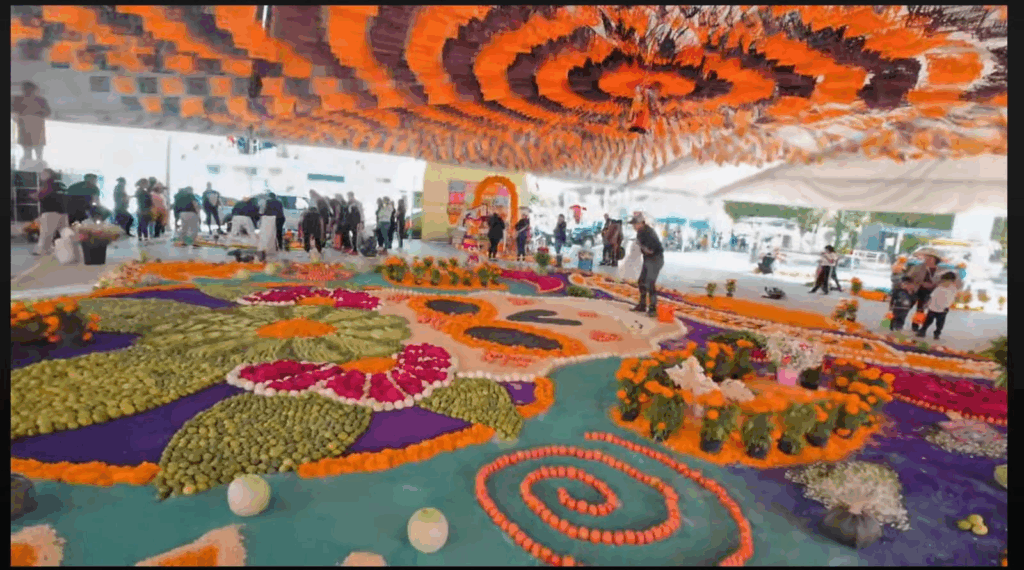 Los Reyes de Juárez, Pue. — Las tradiciones del Día de Muertos se llenaron de color y tradición este año con una obra de arte única: un majestuoso tapete de 100 metros cuadrados (10×10 metros) elaborado con los productos que dan identidad a la región: hortalizas y flores. La obra de arte, instalada en el centro de la cabecera municipal, fue creada para honrar la memoria de quienes ya partieron y reflejar las raíces agrícolas locales. En su primera etapa, se utilizaron productos como cebolla, jitomate, plátano y flor de temporada, demostrando el talento del artista y la colaboración de la comunidad. Mientras este tapete monumental embellecía el centro, en el panteón municipal las familias se congregaban para adornar las tumbas y compartir momentos con sus seres queridos, demostrando que en Los Reyes de Juárez la tradición se vive intensamente, “honrando la vida al mantener viva la memoria”. Navegación de entradas Espectacular el Festival de la Luz y la Vida en Chignahuapan. Inaugura Pepe Chedraui videomapping conmemorativo al Día de Muertos con luz y tradición