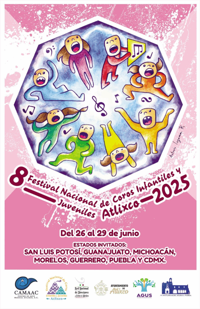 Atlixco, Pue.— El municipio de Atlixco se prepara para llenarse de música, emoción y talento con la realización del 8.º Festival Nacional de Coros Infantiles y Juveniles, que se llevará a cabo del 26 al 29 de junio. Durante cuatro días, niñas, niños y jóvenes provenientes de diversos estados del país unirán sus voces en un canto colectivo que celebra la alegría, el arte y la esperanza. El evento busca fortalecer los lazos culturales a través de la música coral, así como brindar espacios de expresión artística para las nuevas generaciones. Este año, San Luis Potosí, Guanajuato, Michoacán, Morelos, Guerrero y la Ciudad de México son los estados invitados que participarán con sus agrupaciones corales, ofreciendo presentaciones abiertas al público en distintos recintos de Atlixco. Con esta iniciativa, el municipio reafirma su vocación como promotor de la cultura y el arte, fomentando en la niñez y juventud el amor por la música y los valores de convivencia, disciplina y trabajo en equipo. La ciudadanía y visitantes están cordialmente invitados a disfrutar de este festival que se ha convertido en uno de los encuentros corales más significativos del país. Navegación de entradas Organiza el Congreso del Estado, Foro sobre Ciberseguridad en Puebla En México hay libertad de expresión. No hay censura: Claudia Sheinbaum