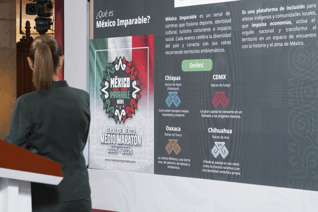 Ciudad de México. — Esta mañana, el Gobierno de México presentó el serial de carreras “México Imparable” una iniciativa que busca fusionar el deporte con la identidad cultural del país y que fue creada a través de la Secretaría de Turismo y la Comisión Nacional de Cultura Física y Deporte (Conade). El circuito se llevará a cabo en diferentes sedes como Chiapas, Ciudad de México, Oaxaca y Chihuahua y tienen por objetivos lograr la inclusión de atletas indígenas e impulsar el turismo deportivo, generando así, beneficios económicos y sociales en las comunidades originarias. En ese contexto, la Presidenta Claudia Sheinbuam Pardo, destacó que el proyecto no solo traerá los beneficios antes mencionados, sino que también simboliza la fuerza y la resistencia del pueblo mexicaono, en específico de las comunidades originarias. Foto: Presidencia “Este nombre de México Imparable es muy simbólico. Representa al pueblo rarámuri: imparable, resistente; a los pueblos originarios, y representa a México, porque México es imparable”, afirmó. La secretaria de Turismo, Josefina Rodríguez Zamora, explicó que el turismo deportivo permite proyectar la riqueza cultural del país, incrementando indicadores como la ocupación hotelera y la derrama económica en comunidades locales. Agregó que actualmente uno de cada 10 turistas internacionales que visitan México realiza actividades deportivas, lo que representa el 10 por ciento del total de llegadas. Foto: Presidencia Por su parte, el director de la Conade, Rommel Pacheco Marrufo, dio a conocer las sedes y fechas del serial: Raíces de Agua, Palenque, Chiapas – 14 de septiembre 2025 (Cultura Maya, Elemento Agua) Raíces de Fuego, Ciudad de México – 7 de diciembre 2025 (Cultura Mexica, Elemento Fuego) Raíces de Tierra, Oaxaca – 22 de marzo 2026 (Culturas Zapoteca y Mixteca, Elemento Tierra) Raíces de Aire, Chihuahua – 7 de junio 2026 (Cultura Rarámuri, Elemento Aire) La líder del proyecto, Mirna Beatriz de la Cruz Álvarez, señaló que los recursos obtenidos a través de inscripciones y patrocinios serán destinados a becas deportivas, eventos culturales gratuitos y apoyos en salud, educación e infraestructura, generando un triple impacto: económico, social y cultural. Foto: Presidencia Asimismo, la ultramaratonista rarámuri y embajadora del programa, Lorena Ramírez Nahueachi, invitó a la ciudadanía a inscribirse a través de la página oficial mexicoimparable.com. Con esta estrategia, el Gobierno de México busca fortalecer el tejido social, visibilizar a los pueblos originarios y consolidar al país como un destino de turismo cultural y deportivo. Navegación de entradas Gobierno de Puebla refuerza respaldo legal y protección a migrantes poblanos en Estados Unidos Inicia reparación de la Carretera Federal 129 Teziutlán-Nautla: Marilyn Ballesteros