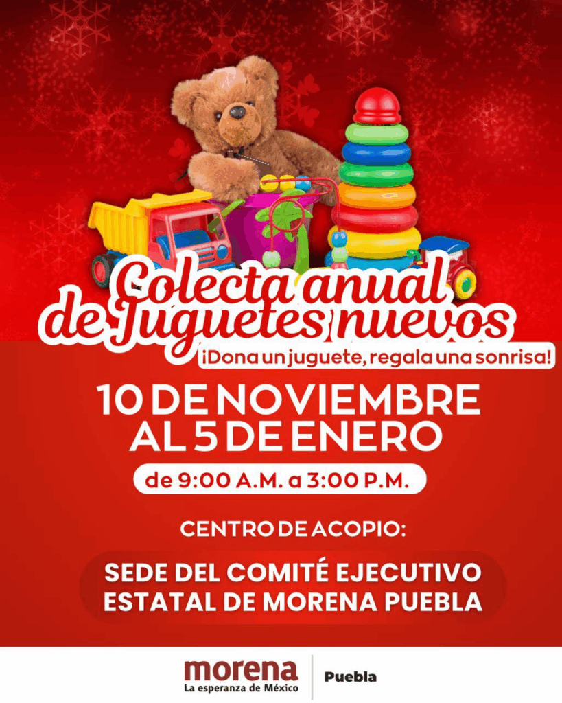 Morena Puebla también hizo un exhorto especial a sus diputadas, diputados y presidentes municipales para que se sumen activamente a la colecta y motiven la participación en sus respectivos distritos y municipios. El objetivo, señalaron, es recolectar la mayor cantidad de juguetes posible para “entregar sonrisas en todo Puebla”.