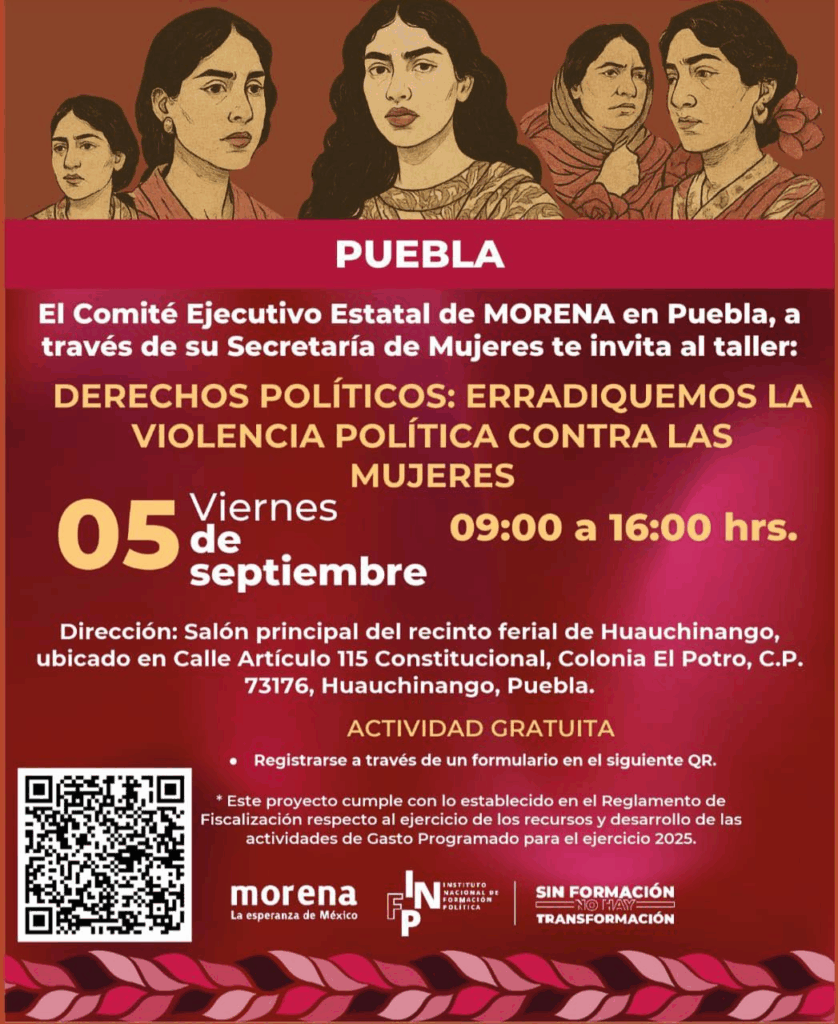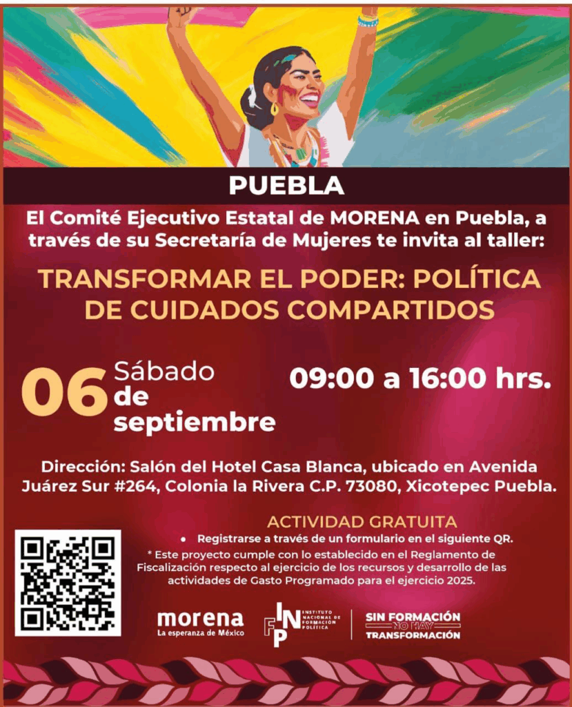 Puebla, Pue.— Con el propósito de fortalecer el liderazgo femenino y promover la igualdad, Morena Puebla, anunció la realización de dos talleres especializados en derechos de las mujeres, dirigidos a militantes, simpatizantes y ciudadanía en general. Foto: Morena Puebla El primero se llevará a cabo el 5 de septiembre de 2025 en el salón principal del recinto ferial de Huauchinango, bajo el tema “Derechos Políticos: Combatiendo la Violencia Política contra las Mujeres”. La jornada se desarrollará de 9:00 a 16:00 horas y tendrá un cupo limitado de 200 participantes con entrada gratuita. El segundo taller está programado para el 6 de septiembre de 2025 en el Hotel Casa Blanca, Xicotepec de Juárez, con la temática “Política de Cuidados Compartidos: Construyendo Nuevas Formas de Liderazgo”. También se efectuará de 9:00 a 16:00 horas, con acceso libre y cupo restringido a 200 asistentes. Foto: Morena Puebla Ambos encuentros tienen como objetivo impulsar la participación política de las mujeres, erradicar la violencia en su contra y promover nuevas formas de liderazgo que permitan avanzar hacia un estado y un país más equitativo. El registro para participar podrá realizarse mediante los enlaces y códigos QR habilitados por la Secretaría de Mujeres de Morena Puebla. Navegación de entradas Presenta informe el gobernador Alejandro Armenta ante el Consejo Nacional de Seguridad El Gobierno de Puebla aplica la ley con diálogo y sin represión