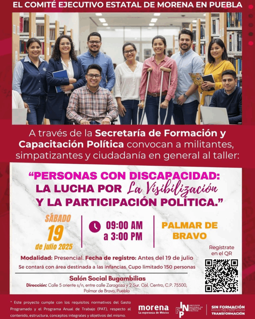 Palmar de Bravo, Pue.— Con el objetivo de fomentar la inclusión y la participación activa de las personas con discapacidad en la vida política del país, el Comité Ejecutivo Estatal de Morena Puebla, a través de su Secretaría de Formación y Capacitación Política, convoca a militantes, simpatizantes y ciudadanía en general a participar en el taller: “Personas con discapacidad: la lucha por la visibilización y la participación política.” El evento se llevará a cabo el próximo sábado 19 de julio, en un horario de 9:00 a 15:00 horas, en el Salón Social Bugambilias, ubicado en calle 5 Oriente s/n, entre calle Zaragoza y 2 Sur, en la colonia Centro de Palmar de Bravo, Puebla. La actividad se desarrollará de manera presencial y es totalmente gratuita. El taller busca ofrecer herramientas prácticas y reflexivas que impulsen la participación política de las personas con discapacidad, así como promover su inclusión en los espacios de toma de decisiones. La intención es construir un camino hacia una sociedad más justa e inclusiva, donde este sector de la población sea reconocido como protagonista de su propio destino. El cupo es limitado, por lo que se invita a las y los interesados a registrarse previamente mediante WhatsApp al número 221 268 2812 o a través del formulario en línea disponible en el enlace: https://forms.gle/j1ZsKD8zNJGtprqa8. Además, el evento contará con un espacio destinado para infancias, para garantizar que más personas puedan participar sin barreras. Morena Puebla reafirma su compromiso con los derechos y la dignidad de todas las personas, y hace un llamado a sumarse a este esfuerzo por una verdadera transformación social basada en la inclusión. Navegación de entradas Claudia Sheinbaum envía reforma constitucional en materia de extorsiones Todos los delitos a la baja, menos la extorsión: Omar García Harfuch