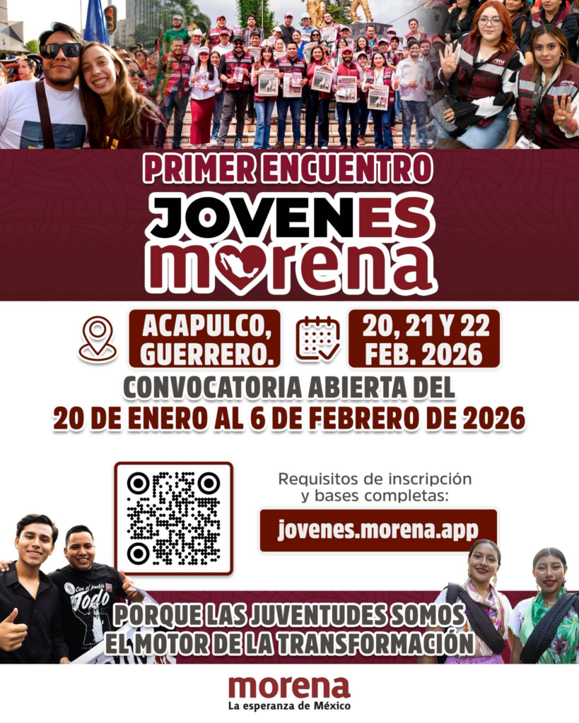 Con el objetivo de impulsar el relevo generacional y fortalecer la participación política de las nuevas generaciones, la Secretaría de Jóvenes del Comité Ejecutivo Nacional de Morena presentó el programa y convocatoria para el Campamento Nacional #JovenEsMorena 2026. Este encuentro busca reunir a liderazgos emergentes para profundizar en la formación política, la organización comunitaria y el trabajo territorial bajo los principios de la Cuarta Transformación. El evento se llevará a cabo los días 20, 21 y 22 de febrero de 2026 en el puerto de Acapulco, Guerrero. La dirigencia del partido señaló que este campamento es una oportunidad estratégica para que las juventudes dialoguen y contribuyan a la vida pública del país, garantizando la continuidad de los valores de no mentir, no robar y no traicionar al pueblo. La convocatoria está dirigida a hombres y mujeres de entre 18 y 29 años que residan en los estados de Puebla, Tlaxcala, Ciudad de México, Guerrero, Morelos e Hidalgo. El proceso de postulación se encuentra abierto desde este 20 de enero y cerrará el próximo 6 de febrero de 2026 a las 23:59 horas. Los interesados deberán realizar su registro digital a través del portal oficial jovenes.morena.app, donde deberán adjuntar en formato PDF su identificación oficial vigente, comprobante de domicilio y una carta de exposición de motivos de máximo una cuartilla. La selección de los participantes se realizará conforme al cumplimiento de los requisitos y el orden de inscripción, respetando el cupo limitado del evento. Quienes resulten admitidos serán notificados vía correo electrónico entre el 12 y el 16 de febrero, momento en el que deberán confirmar su asistencia mediante una carta compromiso. Morena Nacional reiteró que no se considerarán registros incompletos, invitando a la juventud de la región central del país a sumarse a este primer gran encuentro de formación y unidad. Navegación de entradas En marzo inicia la credencialización al Servicio Universal de Salud: Sheinbaum Pepe Chedraui y MariElise Budib reconocen a 15 organizaciones de la sociedad civil en México