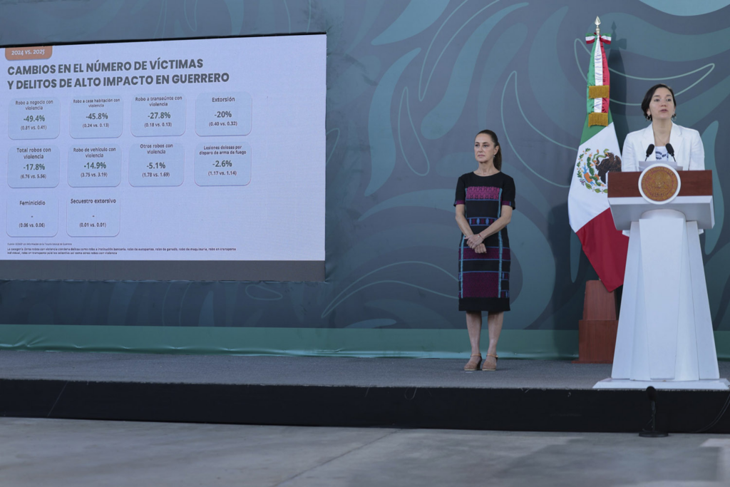 Acapulco, Gro. — En su visita a este puerto, la Presidenta de México, Claudia Sheinbaum Pardo, presentó los resultados de la estrategia de seguridad implementada en el estado, destacando una reducción del 65% en el promedio diario de homicidios dolosos entre octubre de 2024 y diciembre de 2025. En Acapulco, la disminución fue aún más marcada, alcanzando un 71%, lo que sitúa la cifra en menos de un caso diario. Foto: Presidencia La mandataria federal explicó que este avance es producto de la Estrategia Nacional de Seguridad, la cual prioriza la atención a las causas sociales, el uso de inteligencia y una coordinación operativa total con el gobierno de Evelyn Salgado Pineda. Durante este periodo, las fuerzas federales lograron la detención de mil 788 personas vinculadas a delitos de alto impacto y el aseguramiento de 34 toneladas de droga, consolidando al 2025 como el año con menor incidencia delictiva en la entidad desde 2009. Foto: Presidencia Sheinbaum también destacó la implementación del programa “Acapulco Se Transforma Contigo” que ha impulsado la recuperación integral del puerto luego del paso del huracán John por la zona. A través de inversiones en infraestructura, se rehabilitaron mil 539 postes de luz, se avanzó en la construcción de 83 caminos artesanales y se inició la sustitución de los acueductos Papagayo I y II para garantizar el abasto de agua; acciones que han permitido que la actividad turística crezca con una ocupación hotelera histórica del 98.4% al cierre del año pasado. Foto: Presidencia Con la próxima inauguración de la iluminación del Fuerte de San Diego en febrero de 2026, el Gobierno de México reafirma su compromiso de devolver la paz y la prosperidad a Guerrero, combinando el fortalecimiento del orden público con una inversión sin precedentes en bienestar social y servicios urbanos. Navegación de entradas Transformará Alejandro Armenta “La Panga” en el nuevo Puente de la Transformación y polo turístico Encabeza Lupita Bárcenas caravana de Reyes Magos en comunidades de Acatlán