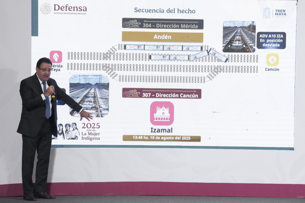 Ciudad de México.— El director general del Tren Maya, general Óscar David Lozano Águila, informó este martes en la conferencia matutina de la presidenta Claudia Sheinbaum que el incidente ocurrido el 19 de agosto en la estación Izamal, Yucatán, no dejó personas lesionadas y que todos los pasajeros fueron evacuados de manera segura. Lozano explicó que el tren 304, proveniente de Cancún, circulaba por la vía principal cuando, de manera inesperada, un aparato de cambio de vía se activó de forma anómala. Esta falla provocó que un bogie del coche número tres se saliera parcialmente de la vía y quedará inclinado al contacto con otro tren, el 307, que se encontraba detenido en el andén. Foto: Presidencia “No fue un descarrilamiento, se trató de un percance de vía. Solo un bogie se salió, lo que causó la inclinación de un vagón”, aclaró el funcionario. De acuerdo con el reporte, la maquinista aplicó de inmediato el freno de emergencia y se activaron los protocolos de seguridad y el Programa Interno de Protección Civil. La Guardia Nacional y el personal de a bordo apoyaron la evacuación: en siete minutos se desalojó el tren estacionado, mientras que para el convoy en movimiento se utilizaron escaleras de emergencia. En total, 261 pasajeros fueron atendidos y trasladados a sus destinos mediante transporte alterno y un tren especial. Una pasajera que debía tomar un vuelo internacional fue llevada de manera directa al aeropuerto de Cancún, logrando abordar a tiempo. Foto: Presidencia El incidente solo ocasionó un retraso de 45 minutos en la operación programada del servicio. El general Lozano destacó que el Tren Maya ha transportado más de 1.5 millones de pasajeros desde su inicio de operaciones y que la Comisión Dictaminadora de Accidentes Ferroviarios, junto con la Fiscalía General de la República, ya investiga el origen de la falla. Foto: Presidencia Como medidas inmediatas, anunció que se reforzarán los sistemas de seguridad con mecanismos mecánicos adicionales en los aparatos de cambio de vía y con dispositivos de comprobación en colaboración con las empresas Voestalpine y Alstom. Finalmente, aseguró que la seguridad de los pasajeros es la prioridad y que se implementarán acciones correctivas para evitar que un percance similar vuelva a ocurrir. Navegación de entradas Sidra de Huejotzingo obtiene Indicación Geográfica; impulsan también certificación de la Tuna Roja de Acatzingo México se Tecnifica: Inversión histórica para garantizar el derecho al agua